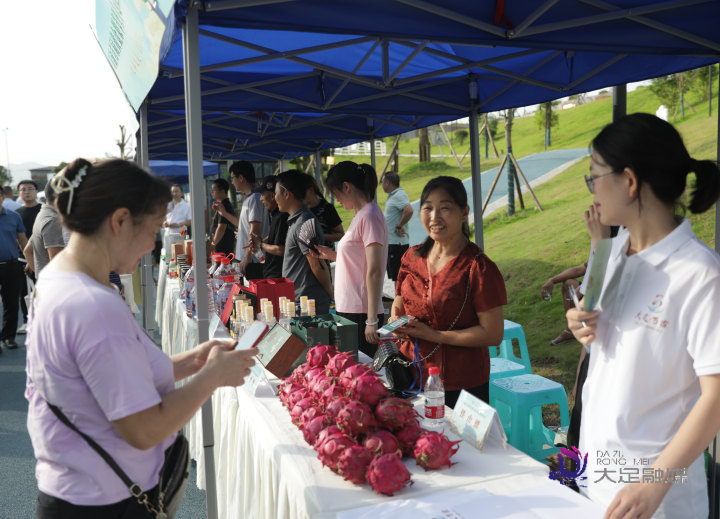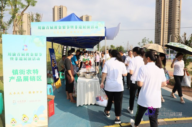 7月25日,川渝首届黄金梨节暨非遗展演活动开幕首日,大足区农特产品展销会在万古镇鲤鱼灯舞文化体育公园举行,大足27个镇街的优质农产品汇聚一堂,各地游客看得目不暇接,被这些物美价廉的产品深深吸引,纷纷出手购买心头好。